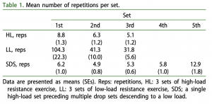 O grupo do treino mais pesado [HL de high load] realizou em média, 8 repetições na primeira série, 6 na segunda e 5 na terceira. Lembrando que todas foram executadas até a falha concêntrica. Nenhuma novidade.