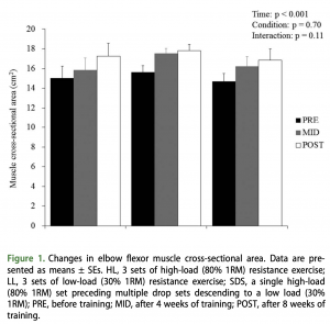 Já o terceiro grupo combinava estímulos tensionais e metabólicos. Esse grupo fazia uma única série com 80% 1RM até a falha, e sem intervalos realizava drop-sets (65%, 50%, 40% e 30% 1RM), todos até a falha, com binando o estímulo tensional da carga inicial, com os metabólicos das cargas subsequentes.